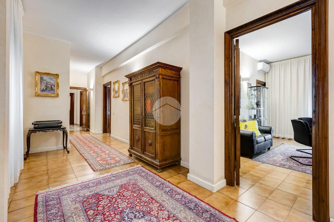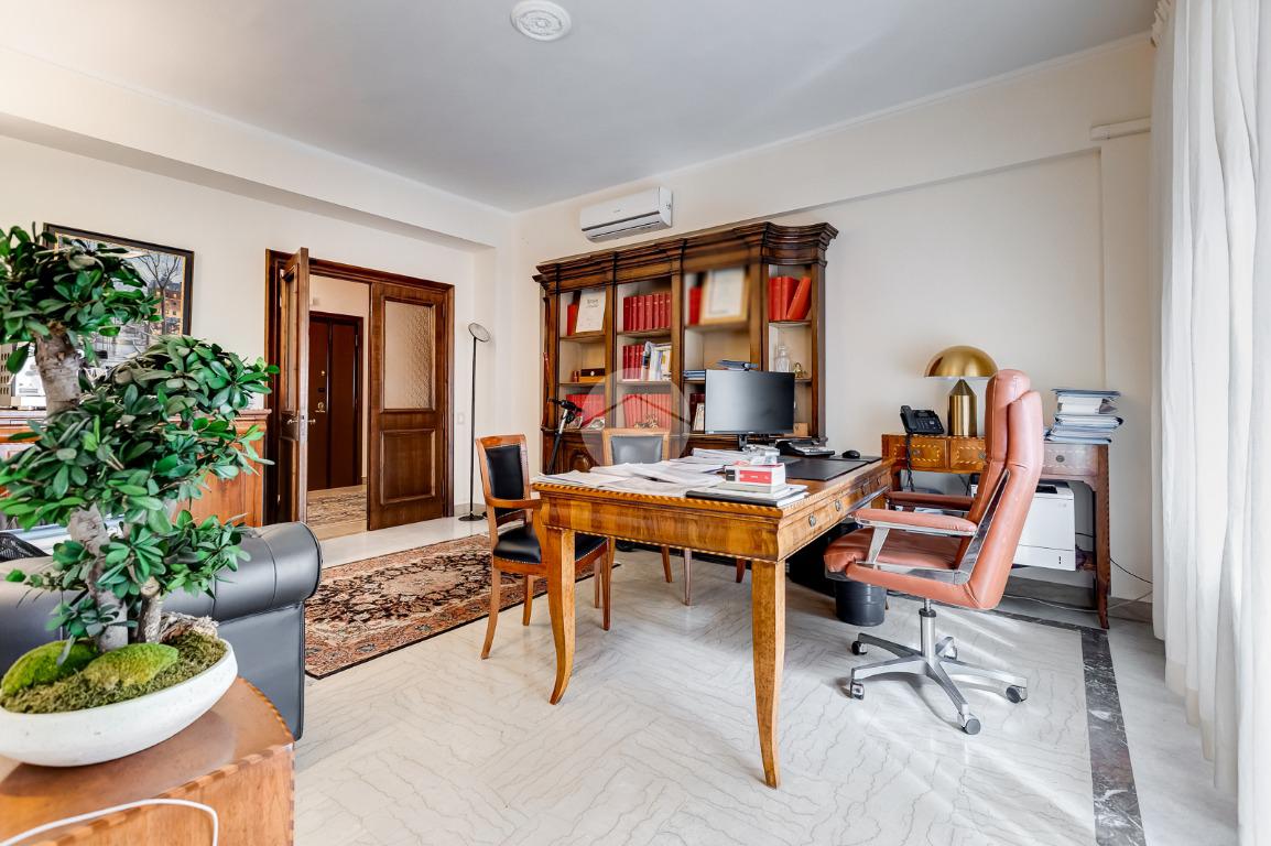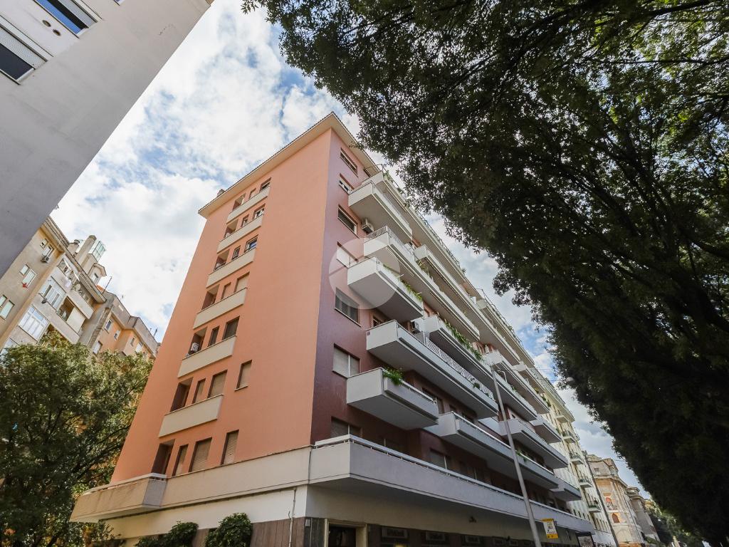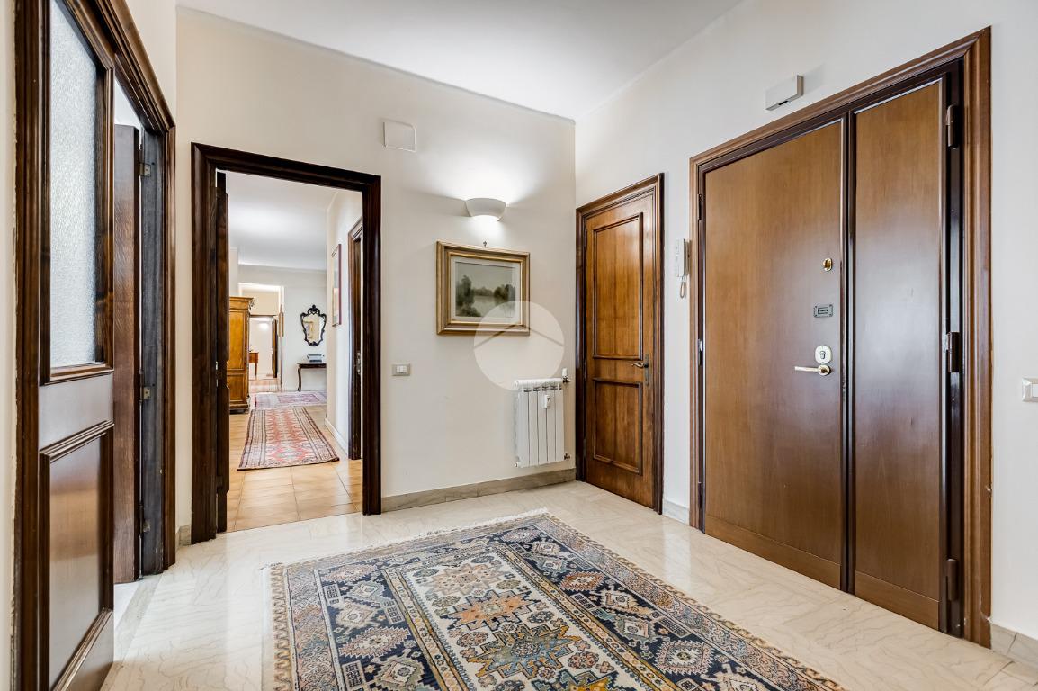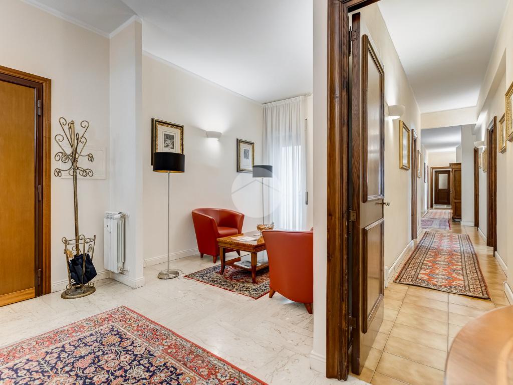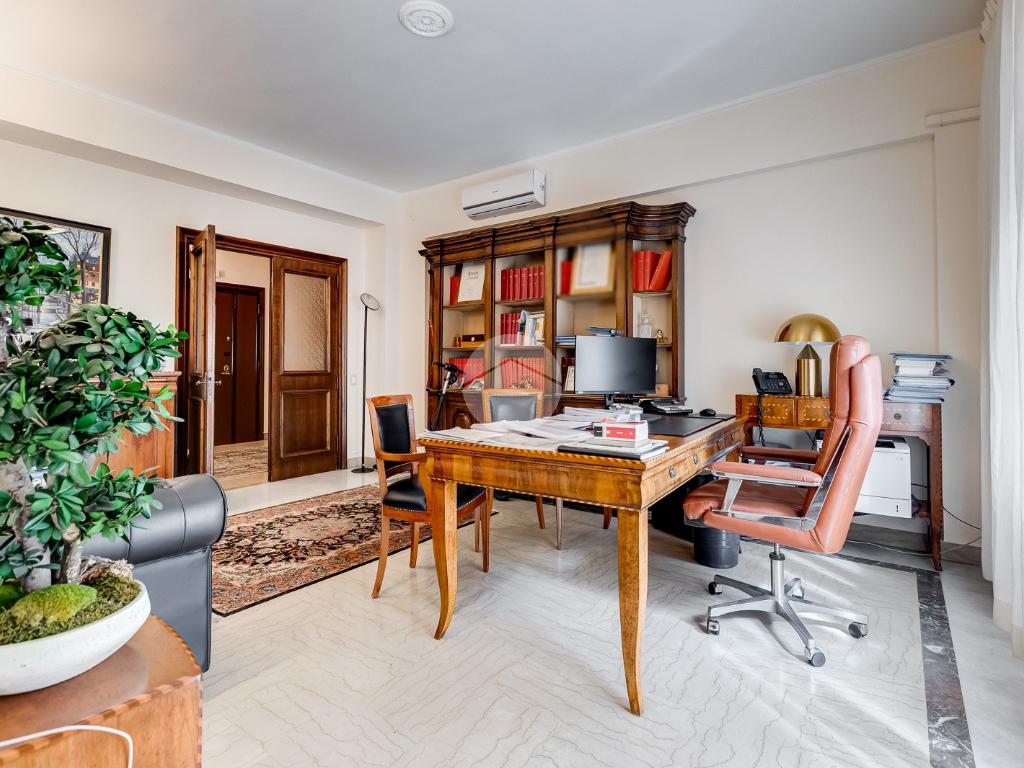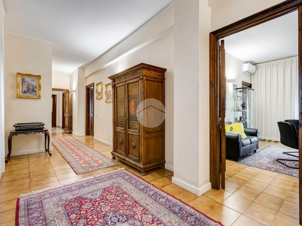 Attualmente si compone di doppio ingresso, sette camere, doppi servizi e due balconi. Si presenta completamente ristrutturato con riscaldamento centralizzato con valvole a consumo e impianto di climatizzazione presente in ogni ambiente.